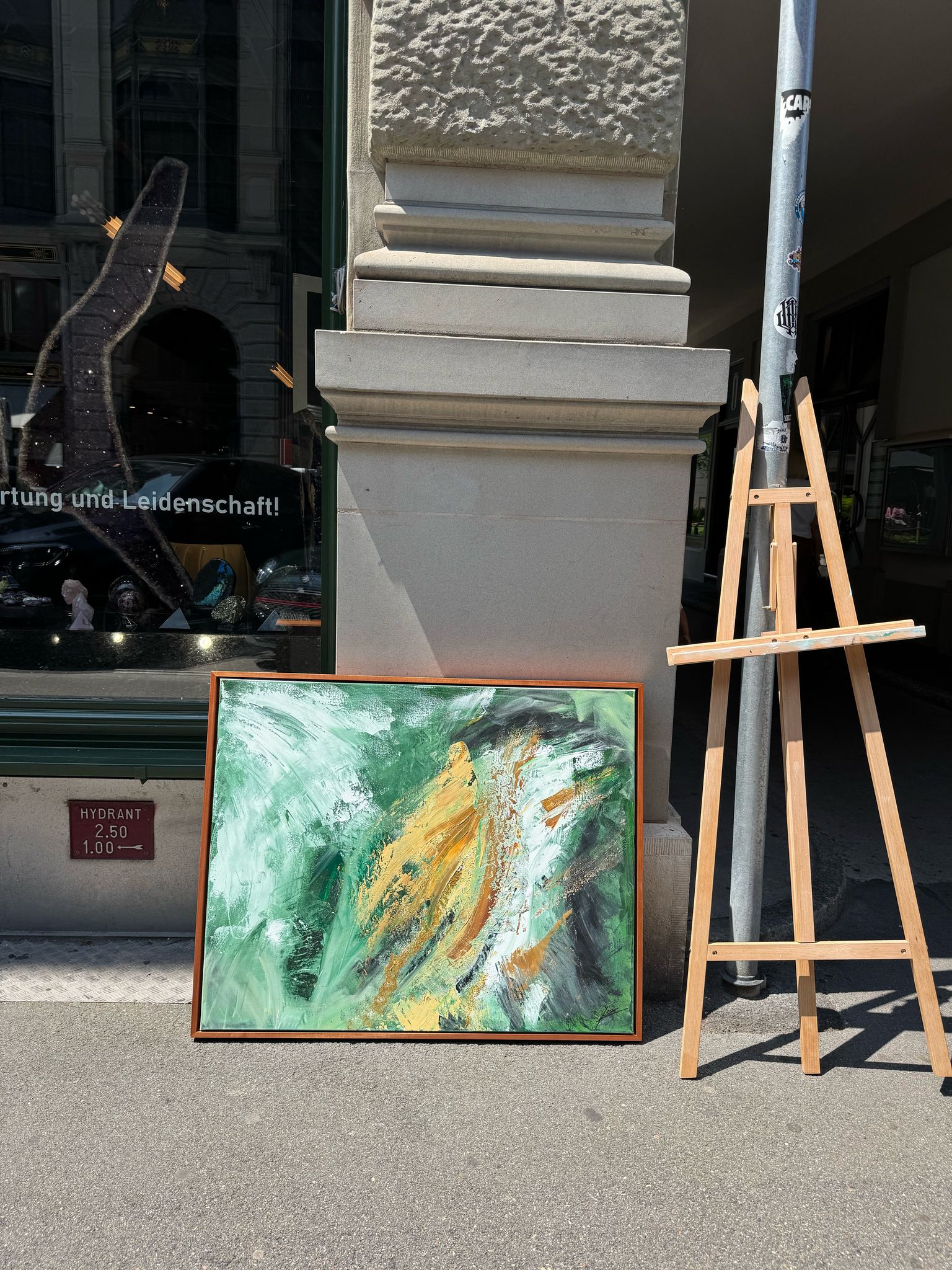 "Green Serenity" invites the viewer into a peaceful, natural landscape where gentle shades of green dominate, softened by delicate touches of brown, yellow, and white. The layered textures and flowing brushstrokes create a sense of quiet movement, like a gentle breeze passing through leaves or sunlight filtering softly through a forest canopy.